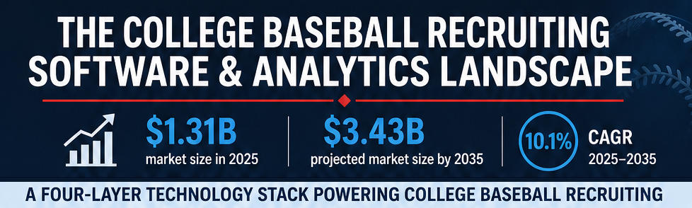 The sports recruiting software market was valued at $1.31 billion in 2025, projected to reach $3.43 billion by 2035 at a CAGR of 10.1%. The space breaks into four distinct technology layers.